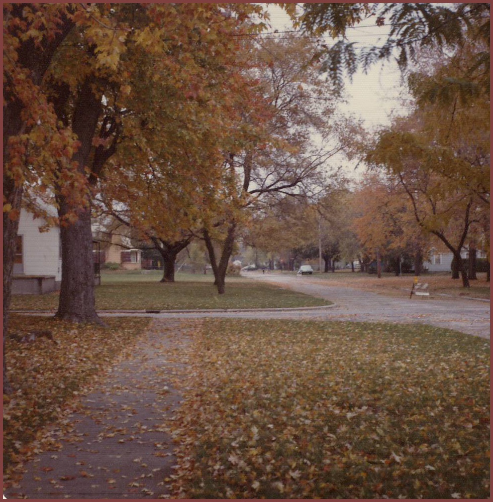 Faded photograph: the view down the street from the last house I lived in in Michigan, October 1974.