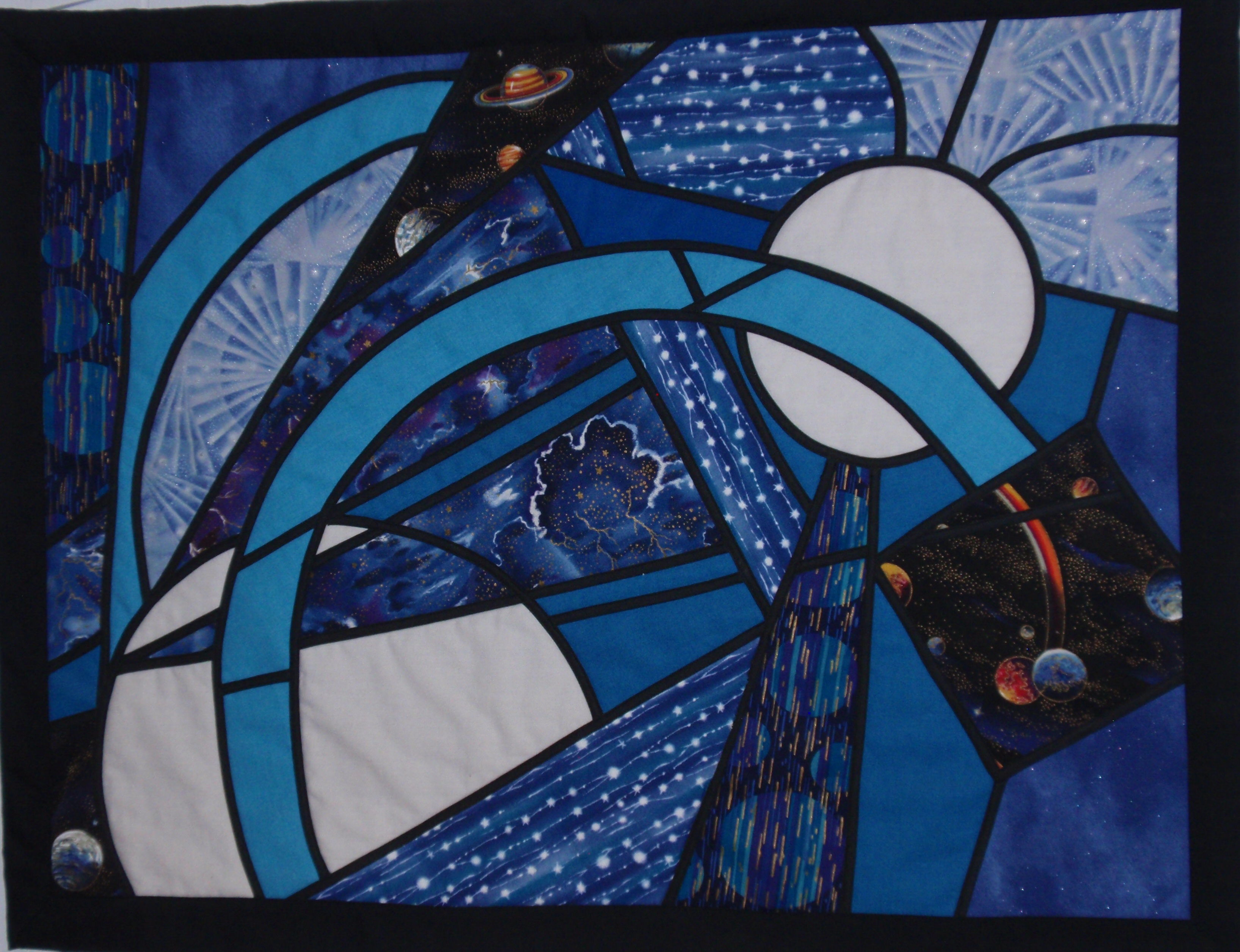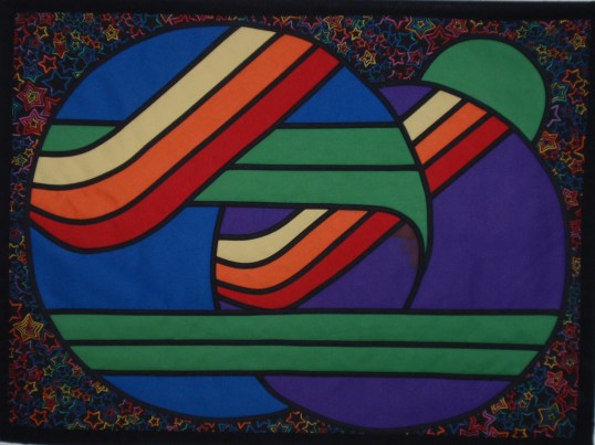 A group of friends was at my house for dinner, and as often happens, we all gravitated to my workroom to discuss my current quilting projects. Silent amongst them stood Joycelyn, who was looking thoughtfully at each of the wall hangings in the room. These were predominantly modern abstract stained glass-like patterns in bright colors using bias tape and sometimes beading. They had been created over many years sans any formal training other than an occasional quilting class and around working full time and raising teenagers; they were just for fun. Later she asked if I could make one like these for her, as she had a space in her living room that called out for something interesting. And with that, our collaborative adventure began.